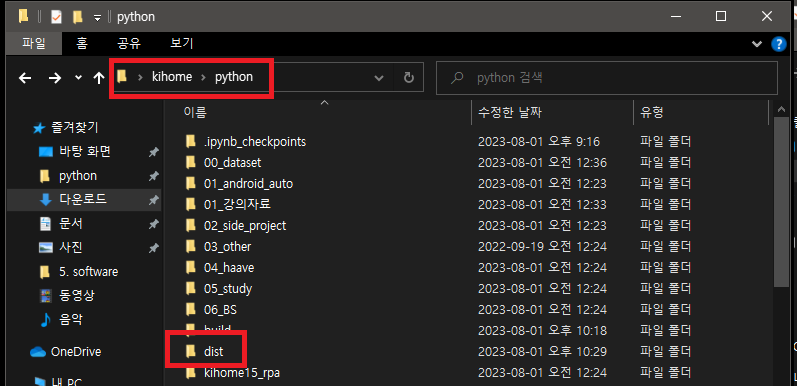 12. python 폴더에서 dist 폴더가 생겼을 겁니다. 들어가보시면